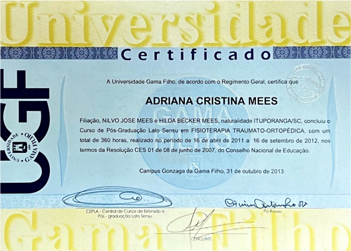* Pós-Graduada em Ortopedia e Traumatologia pela Universidade Gama Filho (UGF), em São Paulo;